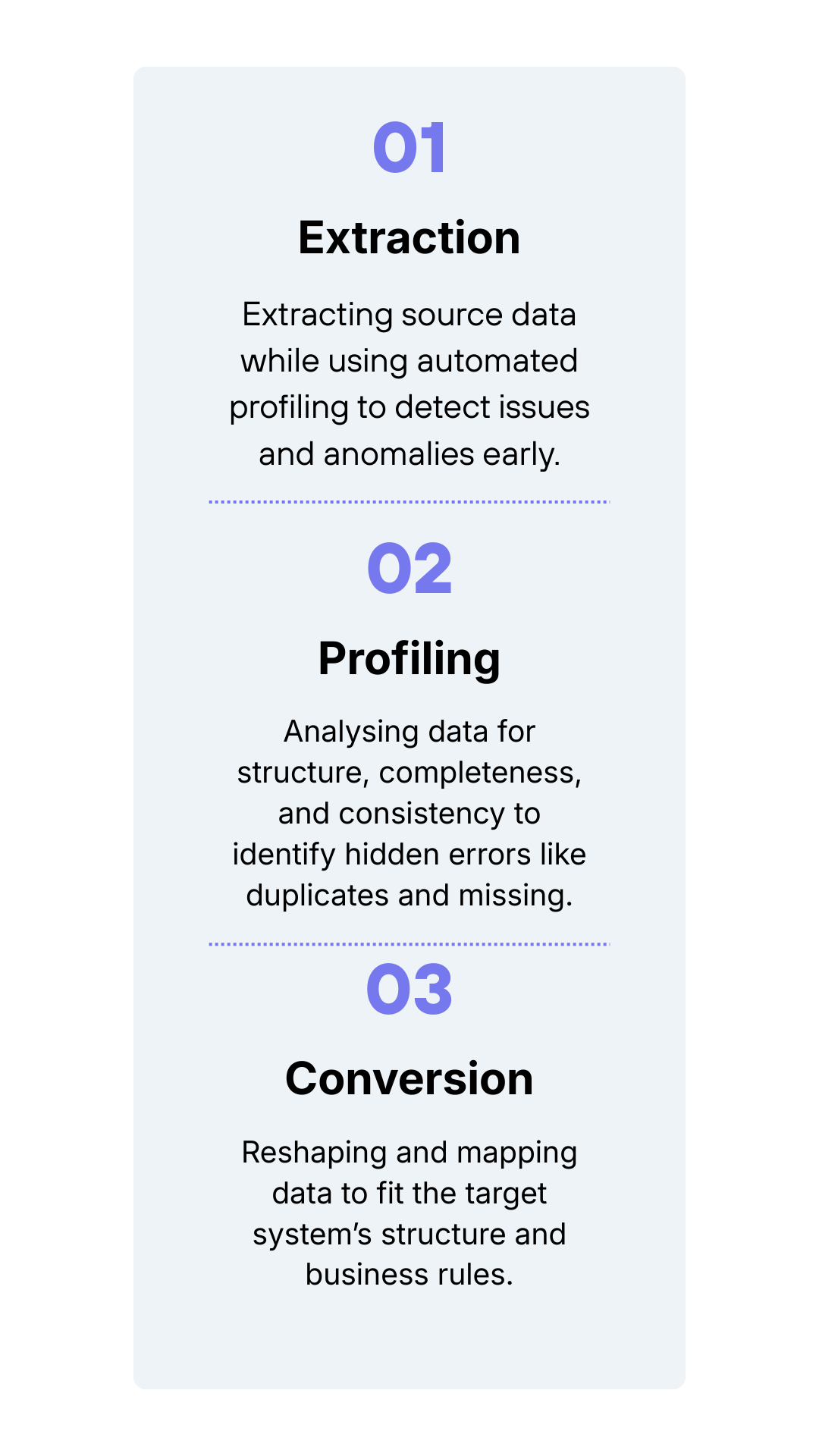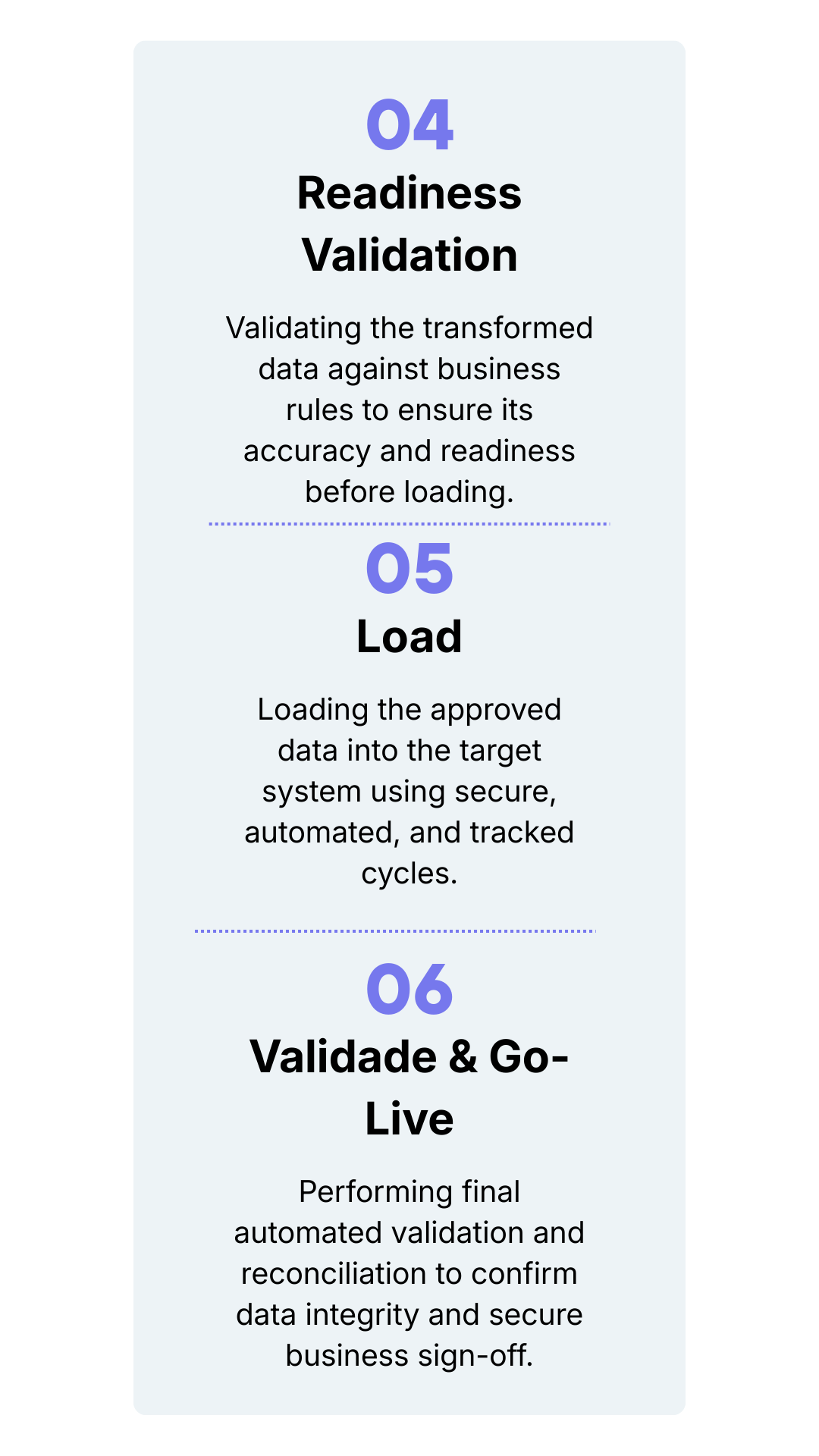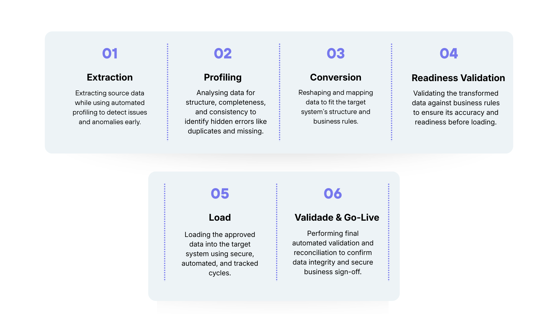 We use a structured, end-to-end approach to analyze, cleanse, transform, and validate your data, ensuring it is accurate, business-ready, and fully prepared for seamless ERP migration.